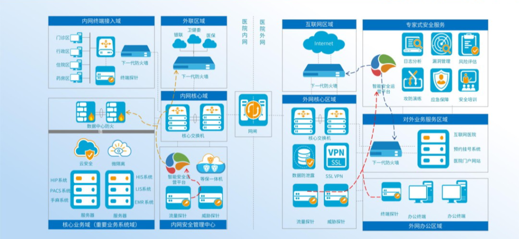 医疗信息化的飞速发展使得医院内的网络和信息系统承载的价值越来越多、网络的规模和复杂度越来越大。过去几年,以勒索为代表的安全威胁给全行业带来了巨大的损失,同时等保的推进和网信办的监管也在有序引导医疗行业加强整体安全运营能力建设。
