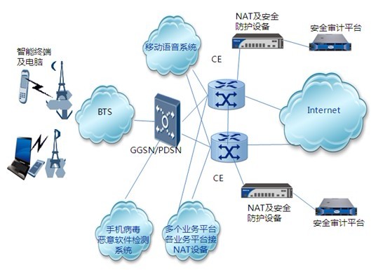 在运营商移动互联网安全防护的市场中,山石网科经过多年的经验积累推出了针对移动互联网安全的解决方案引人关注。山石网科通过在移动互联网接入侧部署安全网关,通过网络地址转换(NAT)功能帮助移动运营商解决地址资源不足的问题;同时,进行网络攻击防护和用户上网日志审计,保障移动数据业务稳定运营和满足监管要求,从而实现私网用户通过NAT方式高速访问互联网、防护来自Internet的DDoS等网络攻击以及记录用户NAT、即时消息(IM)、URL等上网行为日志等功能。