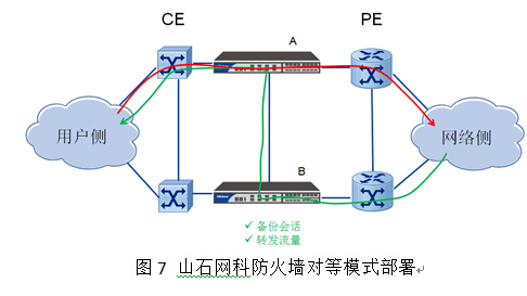 对等模式是山石网科为特殊组网场景考虑的解决方案。要求两台防火墙(工作在透明模式或者路由模式)部署在双活并且起了动态路由协议(如OSPF、BGP)的CE与PE之间,主要做访问控制和攻击防护,路由模式部署时一般还需要做网络地址转换。为了防止由于路由的冗余,会有非对称路由的问题出现:如下图所示,用户侧访问网络侧的流量走一台防火墙,而网络侧回用户侧的流量走了另一台防火墙。防火墙作为状态检测设备,无论是采用单机还是AP/AA模式部署,都会出现由于匹配不到会话,非对称流量无法通过状态检测而中断的问题,同时影响应用流量管理、入侵防御等多个功能。