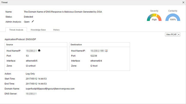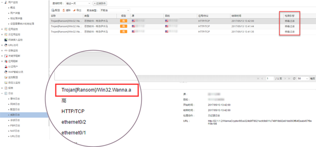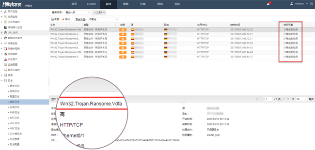 山石网科的域名生成算法(Domain Generation Algorithms, DGA)检测到WanaCrypt0r对异常域名的连接,并将其标记为域名相关的威胁事件。根据这个事件的通知,企业安全管理员应该注意到部分内部主机被WanaCrypt0r感染,从而立即采取策略,阻止病毒的传播。