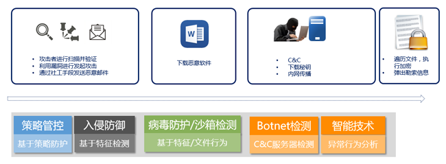 当Wanacrypt0r勒索软件通过网络途径突破入侵防御和病毒过滤的检测及防护,或是通过BYOD带入绕过网络途径的防护措施,进入到执行锁定阶段,山石智能安全检测技术将成为最后一道防线。