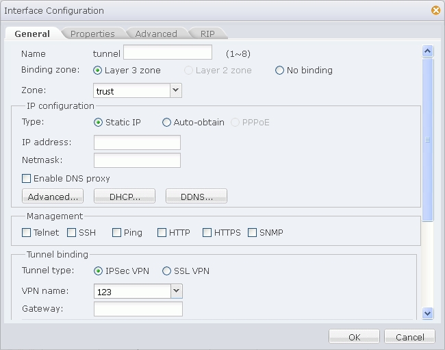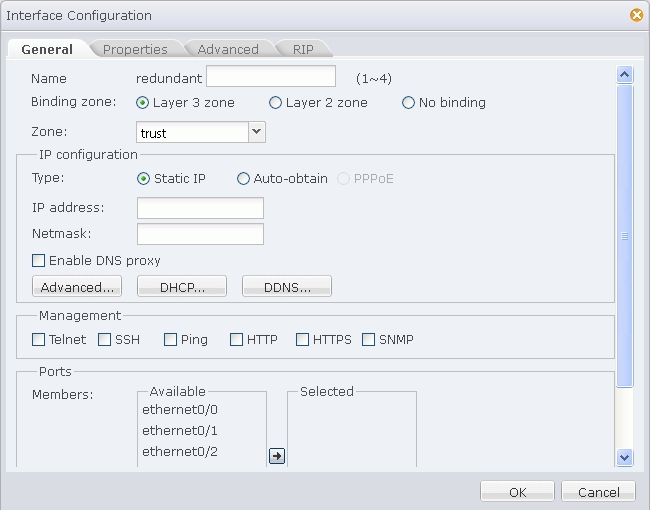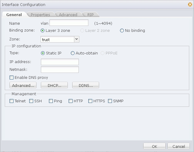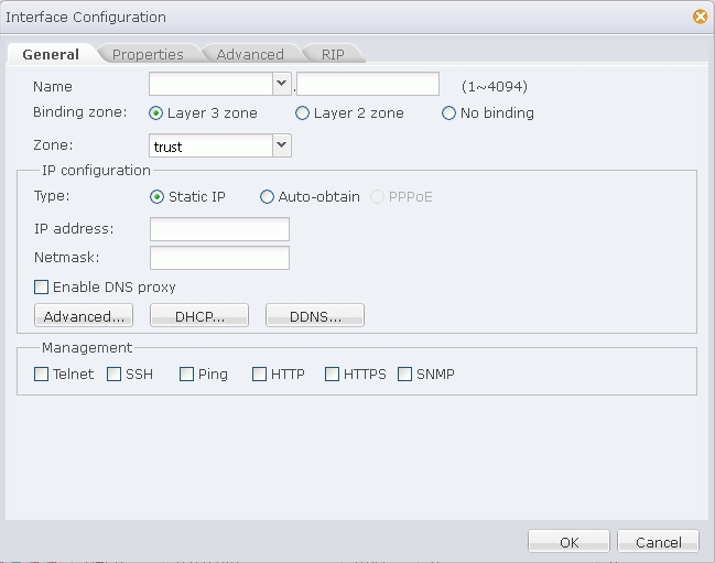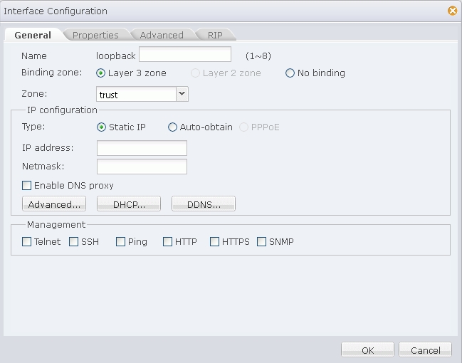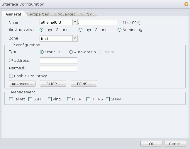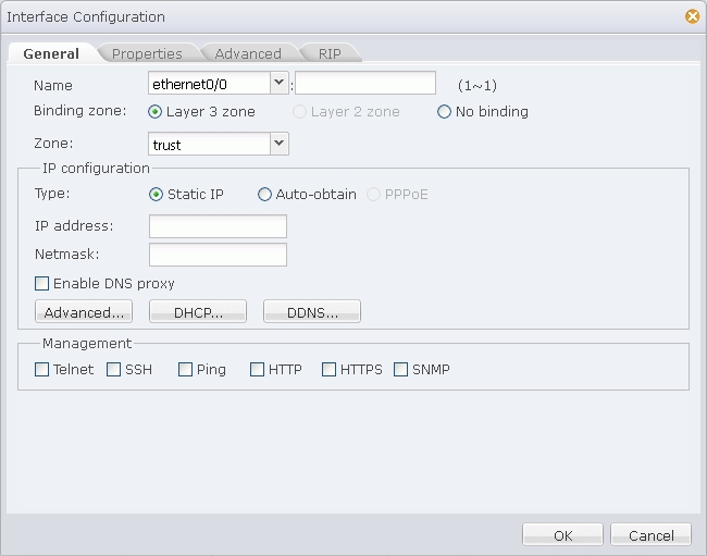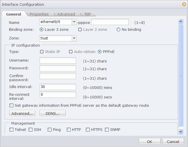 DDNS: In the DDNS Configuration dialog, configure DDNS options for the interface. For detailed instructions, see Configuring a DDNS. - Specify a management method for the interface. In the Management section, select one or more management method check boxes.