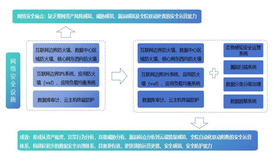 2022年之前,西安国际医学中心医院的安全建设仅在区域网关防护层面,缺乏对院区整网资产的风险感知、威胁感知、漏洞感知及全院联动处置的安全运营能力;同时在数据安全建设方面,无有效手段进行敏感数据的脱敏及数据的分类分级治理,数据安全防护体系尚不完善。